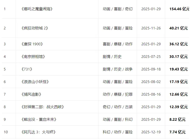 不得不说,《疯狂动物城2》实在太猛了,而从这里我们也可以看出一件事,现在能扛动中国电影市场的,还得是动画电影。这里我们可以来看看去年一整年的中国电影市场,在2025年中国电影市场的票房前十里,动画占了四席,总票房直接冲破250亿,创下历史最高纪录。